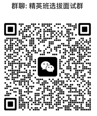 1.请有资格进入面试环节的学生(见附件1:2024级菁英班选拔进入面试学生名单)请务必于10月27日前扫描如下二维码加入微信联络群,后续面试分组抽签、选拔通知等信息将在群里告知,进群后修改备注名:姓名+手机号。